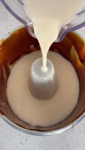 - Em um liquidificador bata o Leite condensado, o creme de leite, o leite em pó e os ovos e bata por 1 minutos;