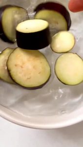 • Lave e corte as berinjelas em rodelas grossas, com altura de cerca de 2 cm. Coloque-as em uma tigela e cubra com água. Reserve desta maneira por aproximadamente 20-30 minutos.