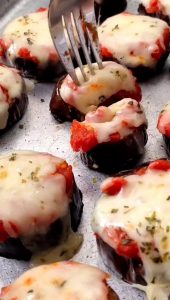 As berinjelas assadas no forno, ficam macias e nessa receita estão acompanhadas por molho e queijo derretido para deixar ainda mais saboroso essa combinação.