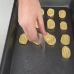 - Com auxílio de uma tábua, amasse a massa e depois deixe-a em rolinho para que possa cortar em formato de moeda (mais grossa) e finalize modelando com garfo a parte superior;