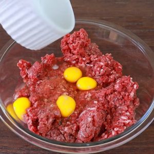 - Em uma vasilha acrescente a carne moída e depois misture com os ovos até incorporarem na carne;