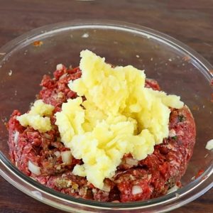- No refratário da carne moída, adicione as batatas amassadas e misture tudo;