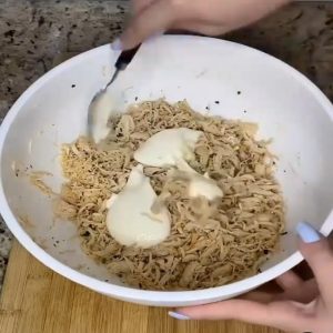- Coloque o frango desfiado em uma vasilha e acrescente o requeijão;