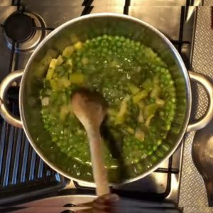 - Junte o caldo de galinha e a água, as ervilhas, os espargos e a hortelã. Quando levantar fervura, cozinhe tapado em lume brando durante 20 minutos.