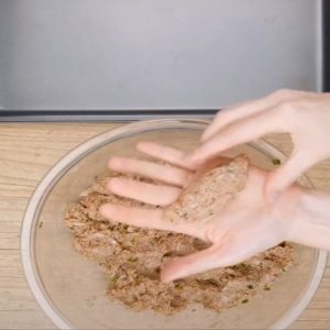 • Após esse tempo coloque o trigo para kibe já hidratado em uma tigela e acrescente a carne, a cebola, a hortelã, metade do azeite de oliva e tempere com sal e pimenta do reino a gosto. Misture bem.