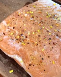 Tempero do salmão: Sal, pimenta calabresa e lemon pepper a gosto.
