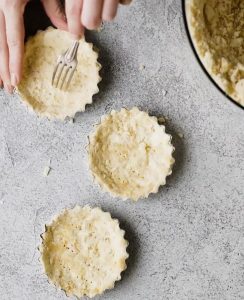 - Distribua a massa em 8-10 forminhas individuais de fundo móvel e leve para gelar por 1h. Depois aqueça o forno a 180°C e asse a base das tortinhas por 25min ou até que estejam douradas. Reserve